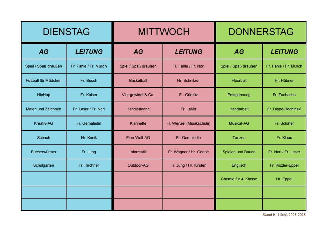 Hier finden Sie unser Übersicht der AGs, diese können Sie sich auch als PDF ansehen oder herunter laden.