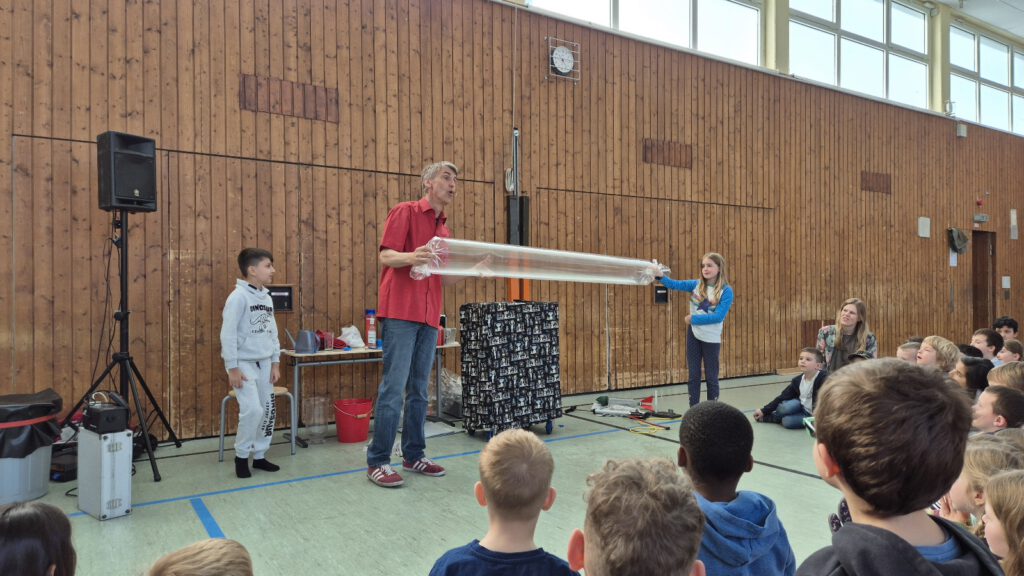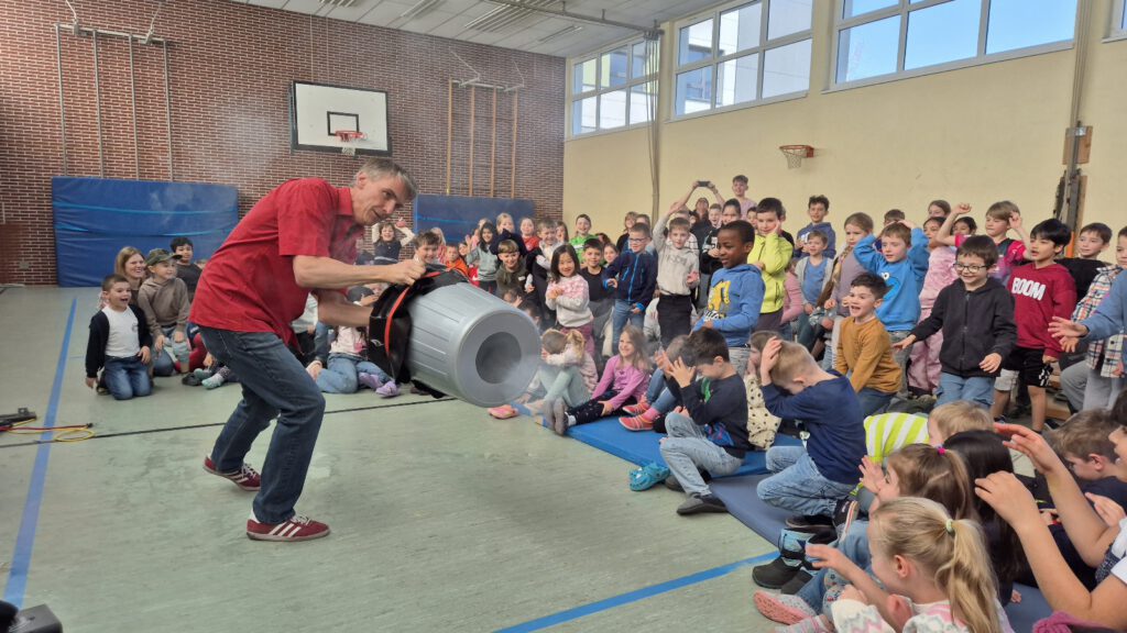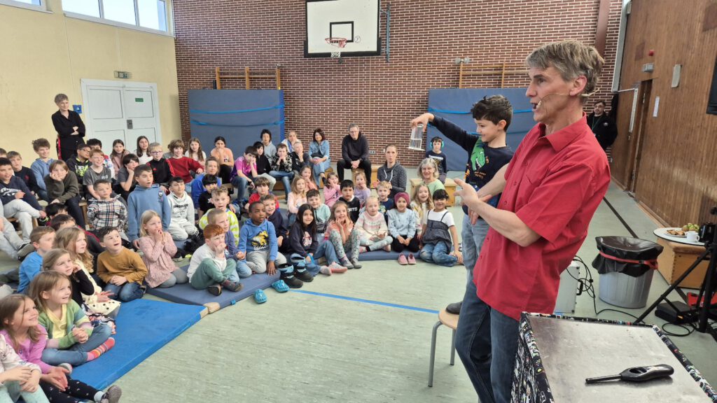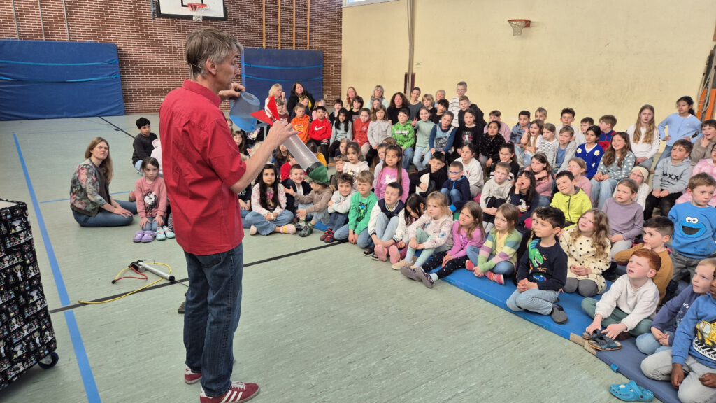 Staunende und hochmotivierte Kinder, fröhliches Lachen und begeisterte Rufe waren in der Turnhalle der Degerfeldschule zu sehen und zu hören. Der Wissenschaftsjournalist Dr. Sascha Ott – bekannt aus der ARD-Sendung „Wer weiß denn sowas XXL“ – war mit seiner Physikanten-Wissensshow zu Gast. Mit dem Programm „Feuerball und Wasserschwall“ begeisterte er die Schülerinnen und Schüler der Eingangsstufe und der Jahrgangsstufen zwei bis vier. Mit seiner gewinnbringenden Art, viel pädagogischem Geschick und seinem Humor brachte er den ca. 490 Schülerinnen und Schülern der Degerfeldschule in anschaulichen Experimenten die vier Elemente „Feuer, Wasser, Erde und Luft“ näher. Anhand zahlreicher Experimente erlebten die Kinder hautnah viele Aspekte des Sachunterrichtes mit dem Schwerpunkt “Natur und Leben“. „Wie kann eine Flaschenrakete die Gravitationskraft ‚austricksen‘? Kann man Luft sichtbar machen? Kann Luft Geräusche transportieren? Usw. Zu den spannenden Experimenten gab es kindgemäße Erklärungen von Sascha Ott, die den Kindern sicherlich noch lange im Gedächtnis bleiben werden. „In spannenden Experimenten erfuhren die Kinder der Degerfeldschule, wie faszinierend Wissenschaft sein kann. Auch die Eingangsstufenkinder kamen aus dem Schauen und Staunen nicht heraus. Alle waren begeistert. Dr. Sascha Ott zeigte, wie viel Spaß Kinder an Naturwissenschaften haben können, und dass wir sie überall um uns herum entdecken können, wenn wir unsere Welt mit neugierigen Augen betrachten!“, so Schulleiterin Cornelia Jüttner-Tunkowski.