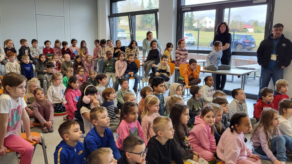 An der Degerfeldschule waren „sprechende Meerestiere zu Gast“. Sabine Fahle, Lehrerin an der Degerfeldschule und ausgebildete Puppenspielerin, hatte ein Puppentheater der besonderen Art aufgebaut. „Habt ihr schon einmal ein Korallenriff gesehen, bei dem die Meeresbewohner die Zuschauer zum Mitmachen Degerfeld – Nachrichten Mitteilungen für Eltern, Kollegium und Mitarbeiter der Schule Nr. 122 – März 2026 einladen?“ …. nun zum Inhalt des Stücks: „Apropos Einladung: Das Seepferdchen hat alle zur Faschingsparty eingeladen. Doch Frau Muschel hat ihre Perle verloren. Ohne Perle kann sich Frau Muschel aber nicht als sie selbst verkleiden. Zum Glück ist Tina Tintenfisch zur Stelle. Sie fragt den frechen Clownfisch um Rat. „Wo könnte die Perle sein?“ Der Clownfisch versteckt sich zunächst und ruft: „Purzelbaum-Badeschaum!“ Doch schließlich vermutet er, dass die Perle im Gewässer der Haie ist. Tina Tintenfisch macht sich mit den Kindern auf den Weg dorthin. Gemeinsam vertreiben sie den Hai, der nach Australien flüchtet. Sie ziehen alle mit einem lauten „Hau-Ruck“ die Perle aus dem Sand. Jetzt steht der Faschingsparty nichts mehr im Wege: „Wir haben oben gute Laune, unten gute Laune…!“ singen alle vor Freude. Eine gelungene Veranstaltung und ein herzliches Dankeschön an Sabine Fahle.