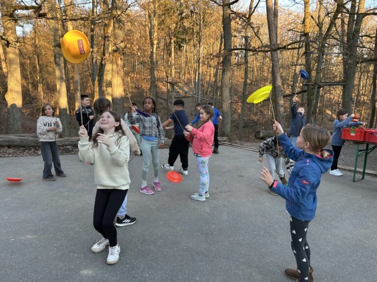 Die Drittklässler der Degerfeldschule erlebten ein tolles Zirkusprojekt während ihrer Klassenfahrt Grävenwiesbach vom 02.03. bis zum 04.03.2026. in Die dritten Klassen trafen sich am Montag um 9 Uhr auf dem Schulhof, kurz darauf fuhr der Bus Richtung Grävenwiesbach los. Dort angekommen ging es zunächst in einen Speiseraum. Durch den Herbergsvater wurden Regeln erklärt und Fragen geklärt. Nach dem Beziehen der Betten und einem stärkenden Mittagessen begann das Zirkusprojekt. Dabei wurden zunächst die verschiedenen Bereiche vorgestellt: Clown, Zauberer, Artist und Bodenakrobatik. Am ersten Tag durften alle Kinder alle vier Möglichkeiten ausprobieren, am nächsten Tag sollten sie sich für einen Bereich entscheiden. Dieser wurde dann sowohl am Vormittag als auch am Nachmittag intensiv erprobt und geübt. Am Abend gab es dann die Zirkus-Vorstellung, bei der die Kinder ihr neu erworbenes Können vorführten. Dabei wurde viel gelacht, gestaunt und applaudiert. Anschließend ging es zur Nachtwanderung mit Rudi, dem ehemaligen Leiter der Jugendherberge, seinem Hund Tali und interessanten Geschichten. Die Klassenfahrt nach Grävenwiesbach war ein großartiges Erlebnis für die Schülerinnen und Schüler der Jahrgangsstufe drei: Neben der Jugendherberge gibt es einen schönen Bach, an dem die Kinder spielen und Staudämme bauen konnten. Außerdem gab es Basketballplätze, Fußballplätze und Tischtennisplatten, so dass es nie langweilig wurde. Alle Kinder waren sich einig, dass es, obwohl einzelne Kinder Heimweh hatten, eine tolle und lustige Zeit in Grävenwiesbach war.